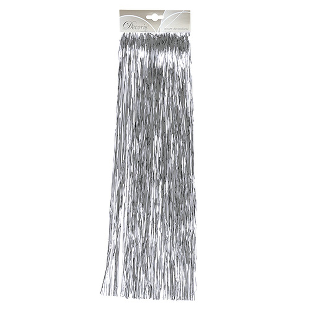 The silver tinsel, with its many strands, hangs from a long strip at the top and is attached to a cardboard hanger. You can easily separate the tinsel strips and use them as desired. The silver tinsel has a total length of approximately 50 centimeters and a width of approximately 40 centimeters.