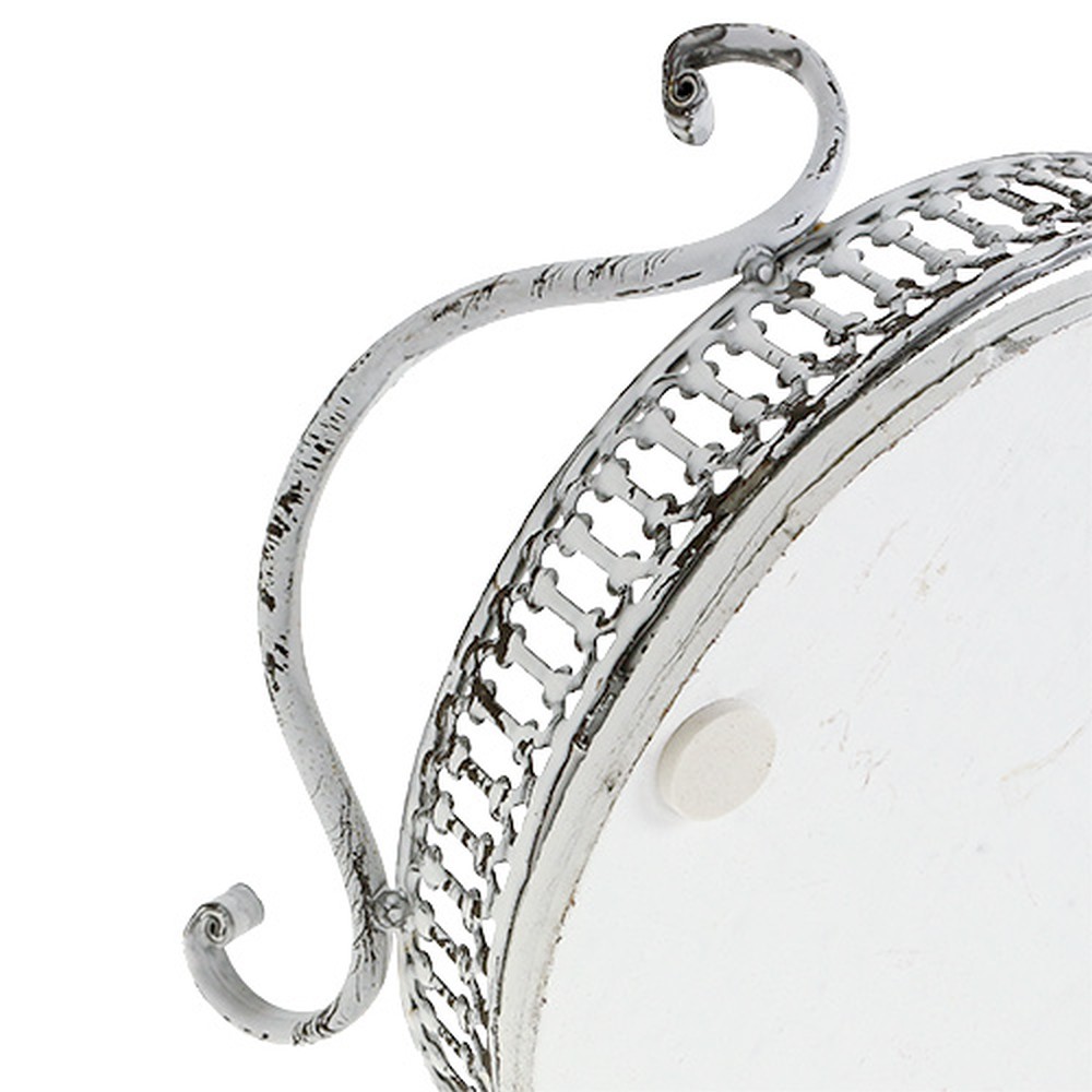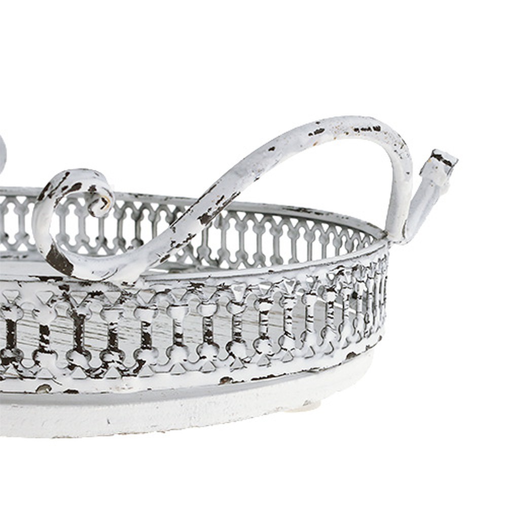 The oval tray has a wooden base and a frame with metal handles. Both materials are washed white for an artificial aging effect. The tray is about 23 centimeters long, about 17.5 centimeters wide and including the handles about 7.5 centimeters high, without handles 4.5 centimeters.