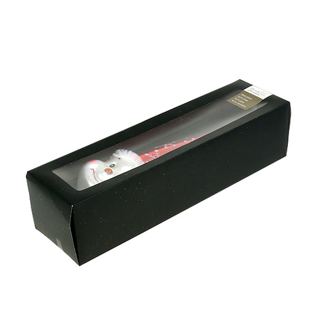 The tree top, made of red and white-silvery painted glass, is around 30 centimeters long and hollow all the way to the top of the hat. The snowman's head is approximately three inches in diameter and the opening is approximately one inch in diameter. The tree top is securely packed in a plastic and cardboard box.