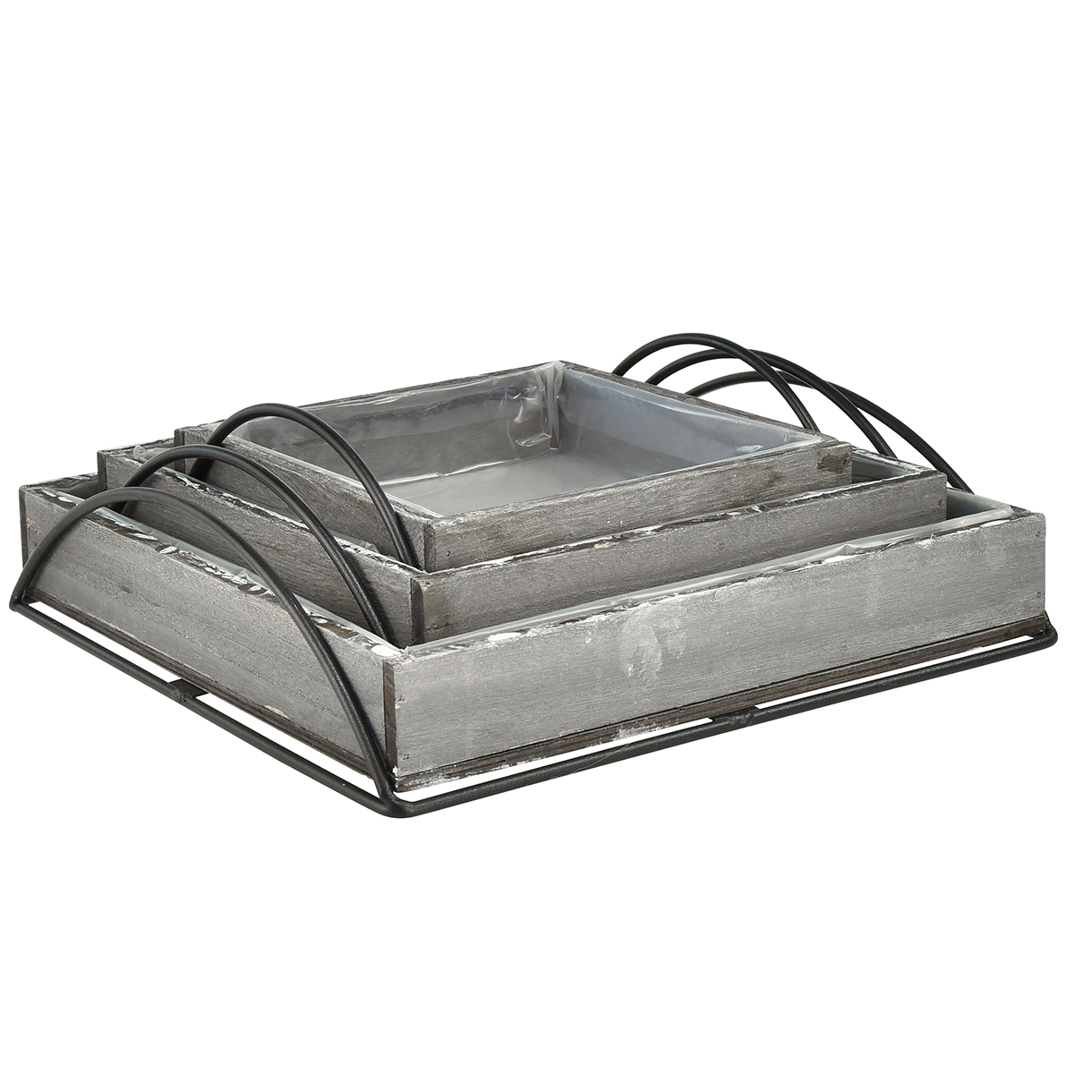 Discover our grey and white washed set of 3 wooden trays resting on elegant metal frames. Each wooden tray with metal handles not only offers practical storage, but also adds a touch of class to any table setting. For event planners, decorators and florists, this wooden tray set in various sizes is an ideal addition to their repertoire of decorative elements.