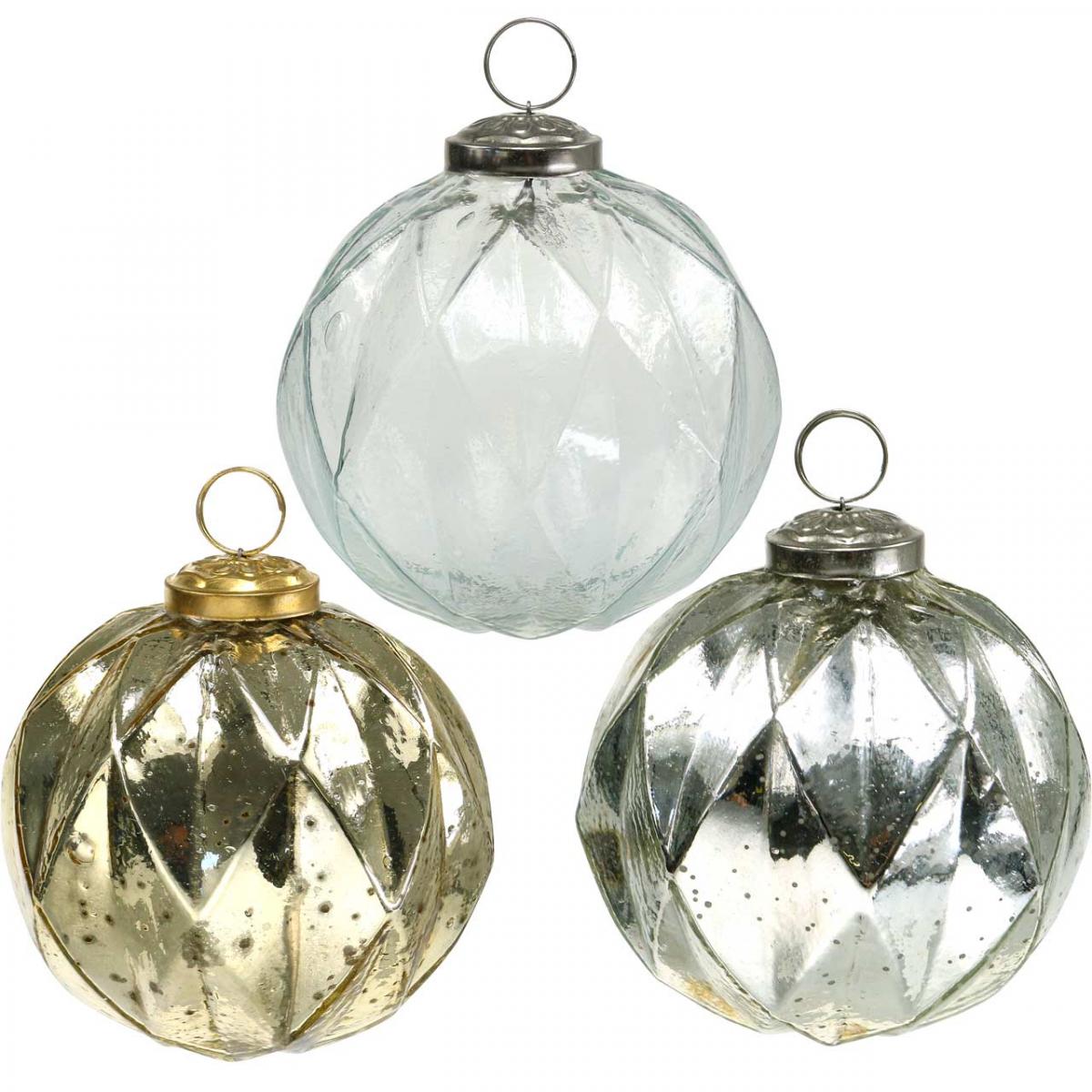 The Christmas baubles with a pattern of diamonds, which decoratively form the Christmas tree decorations made of glass, come in three different colors: transparent, silver and golden, the Christmas baubles are left in an extravagant look or colored from the inside.