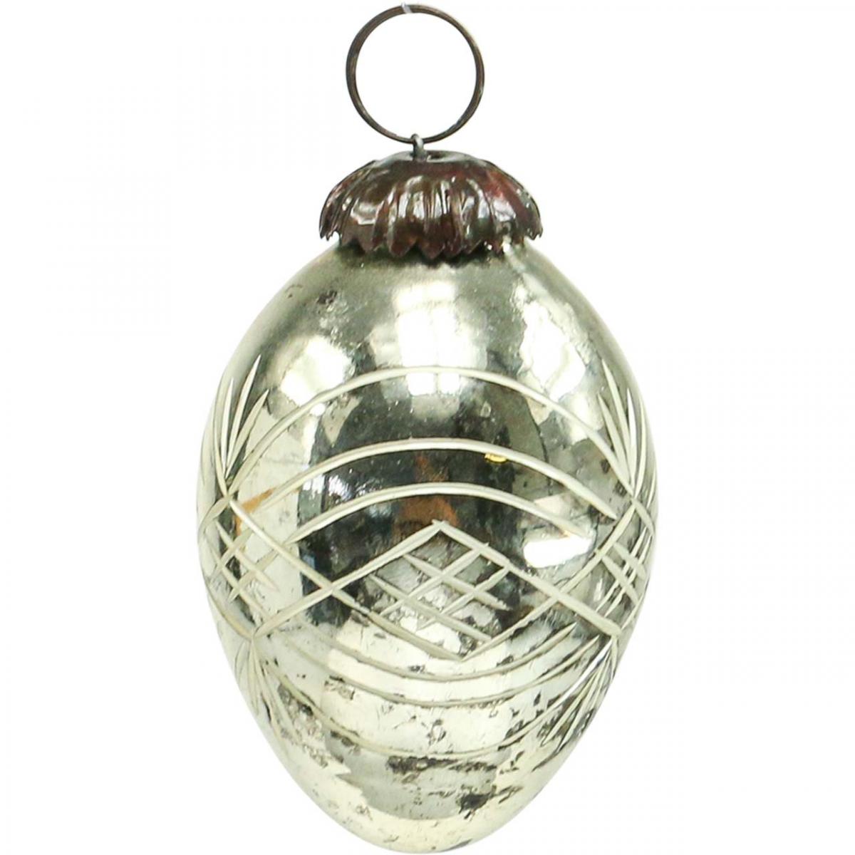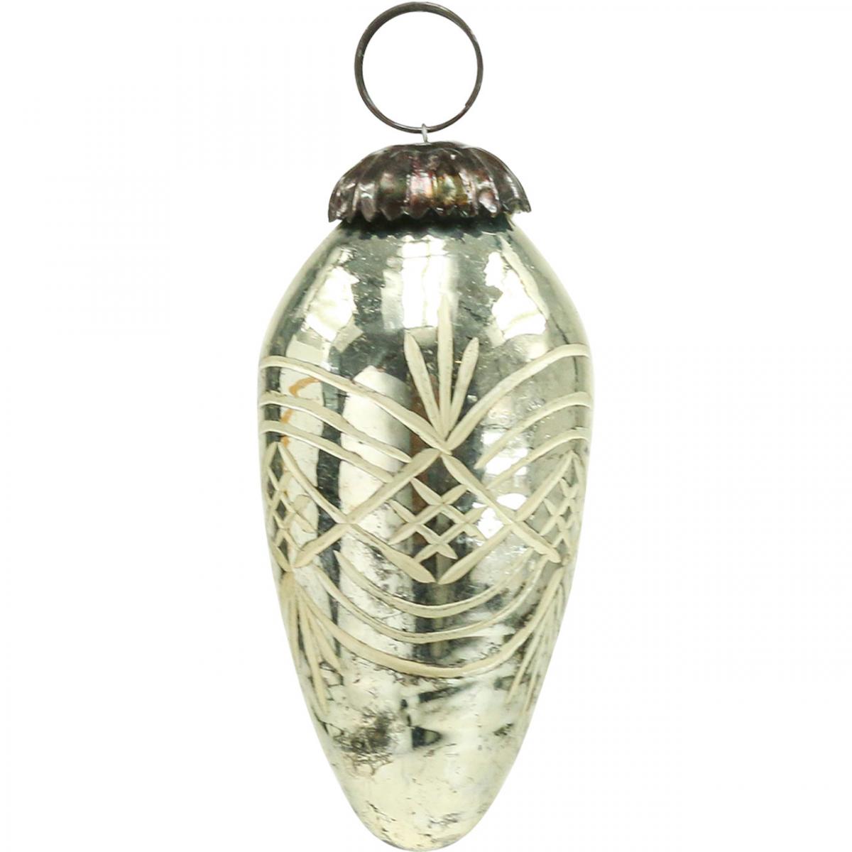 These vintage Christmas decorations exude nostalgic charm during the festive season. The silver Christmas tree balls made of glass look like they are from the old days. The tree decoration comes in three different bulbous, oval and pointed shapes.On the outside, the reflective surface of the Christmas baubles is decorated with a traditional pattern of sweeping curves that have been engraved into the glass. A copper-colored sleeve with a hanger at the top completes the glass Christmas baubles.
