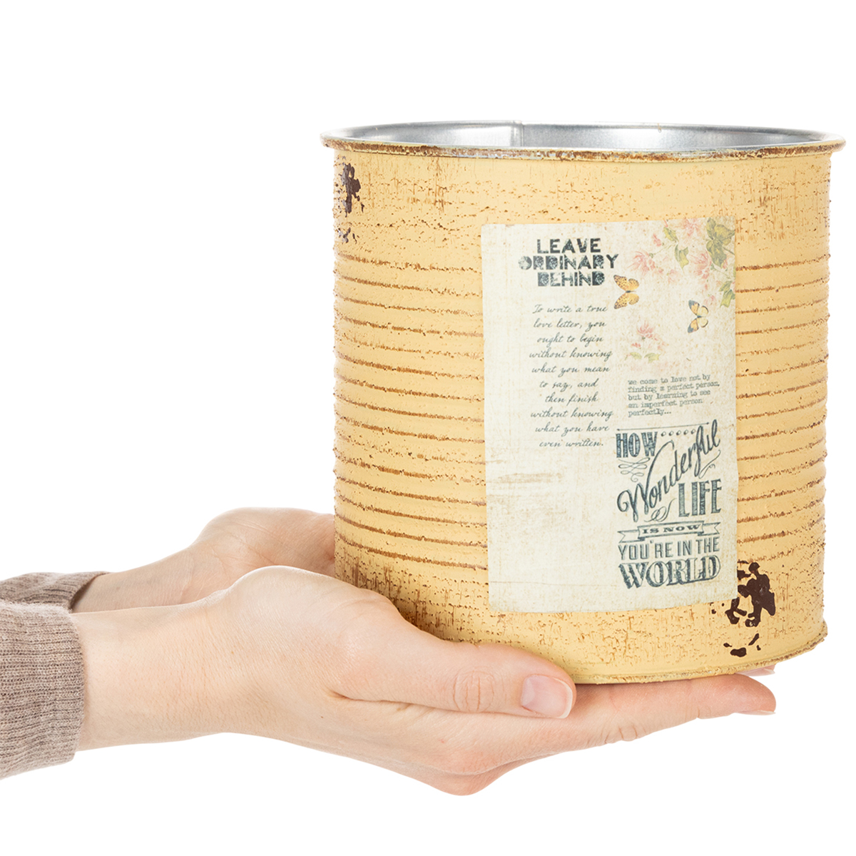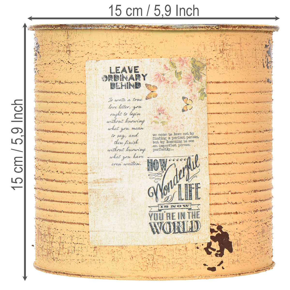 This lovingly designed vintage-style flower pot will make any decorating project a special highlight. Thanks to the retro accents and painted rust effects, these unique planters create a cozy atmosphere – perfect for country style or a rustic setting. The combination possibilities are virtually endless – whether as a decorative planter for houseplants, lined with foil as a planter, as a DIY vase for dried flowers, or as an organizer for pens and small accessories. Each can is 15 centimeters high and a true multi-talent.