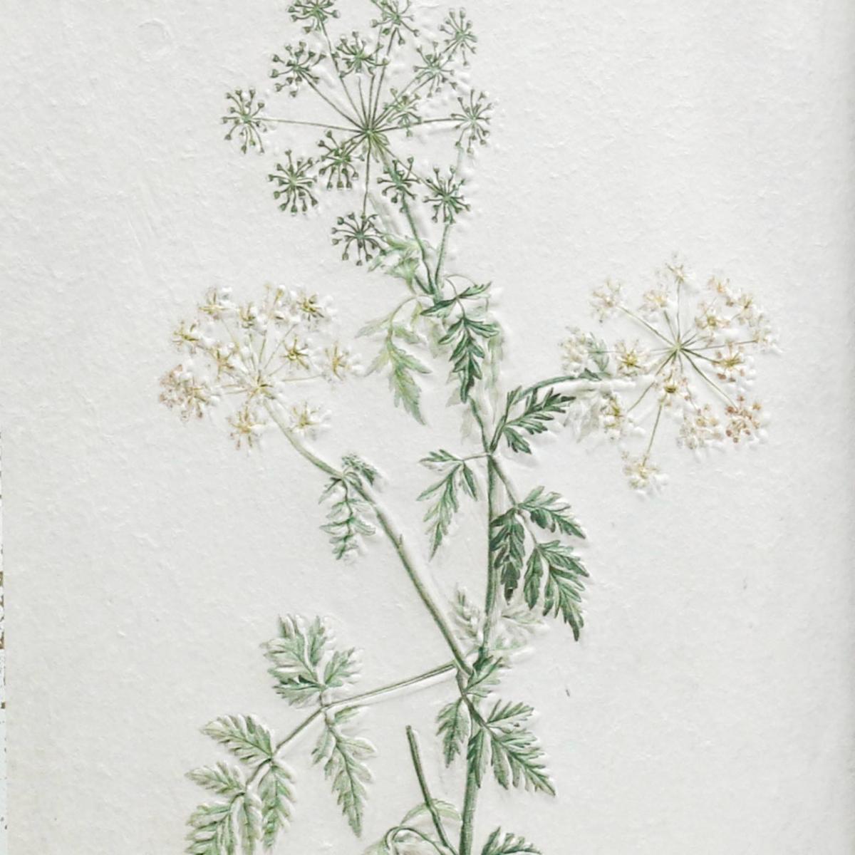 This printed picture with a frame shows a dried plant with its green flowers, leaves and stem. The stylized motif of the painting is reminiscent of hemlock. Metal hooks are attached to the back of the wooden frame for hanging. Wooden frame and canvas form one piece. The decorative picture can therefore not be removed and the frame cannot be used for other pictures. The traces of time can be seen in the peeling paint on the rustic picture frame.