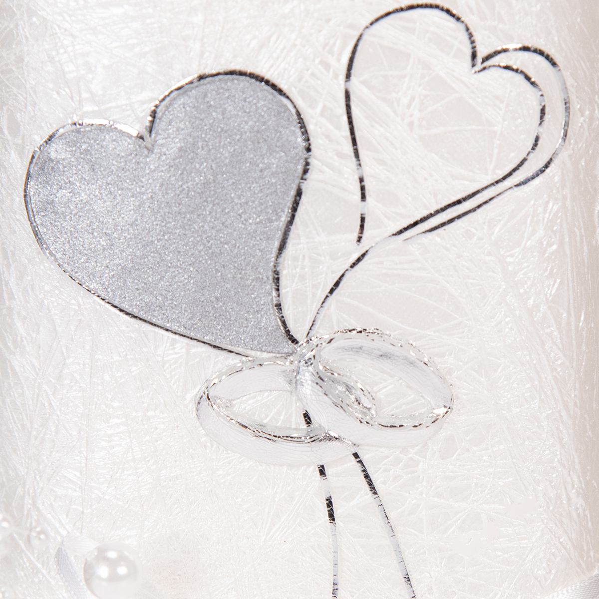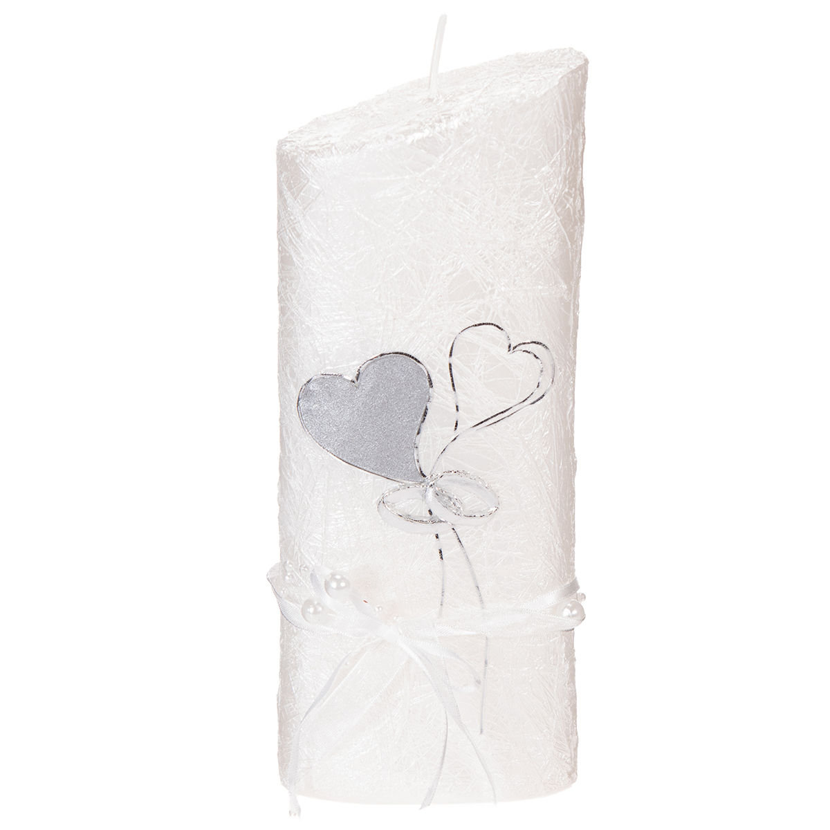 Two hearts on stems are held together like a bouquet of flowers by two intertwined rings. The wedding candle is also decorated with a white ribbon and pearls, which looks beautiful in the wedding decor. However, this decoration must be removed before lighting the candle.