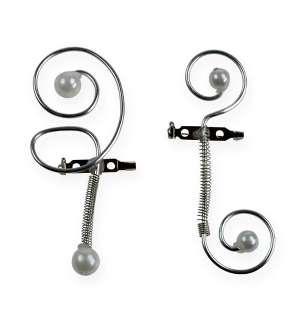 The wedding pin in silver with pearls is in a box with a total of 24 pieces. These are already pre-curved with curves and small circles and look a bit like clefs. One half of the decoration set, i.e. 12, is processed and shaped slightly differently than the other half. Of course, you can then bend and shape these as you wish. Some are about 8 centimeters and the other about 8.5 centimeters long.