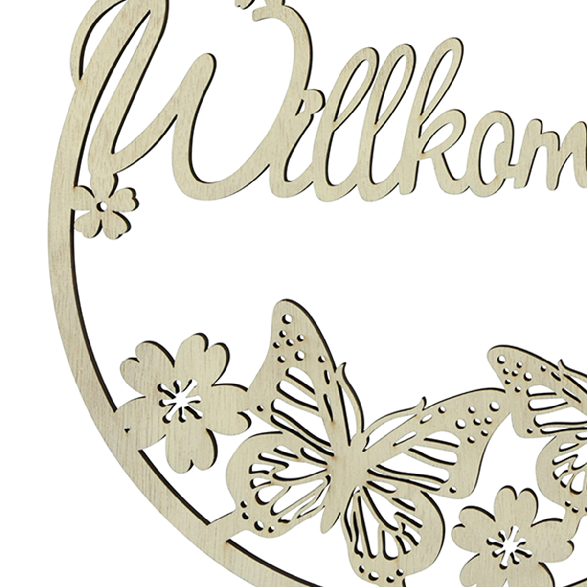 Flowers and butterflies frame the curved welcome in the wooden decorative ring. The hanging decoration is made in a light natural color, so that the dark brown edge makes the spring motif itself appear even stronger, like a 3D effect.