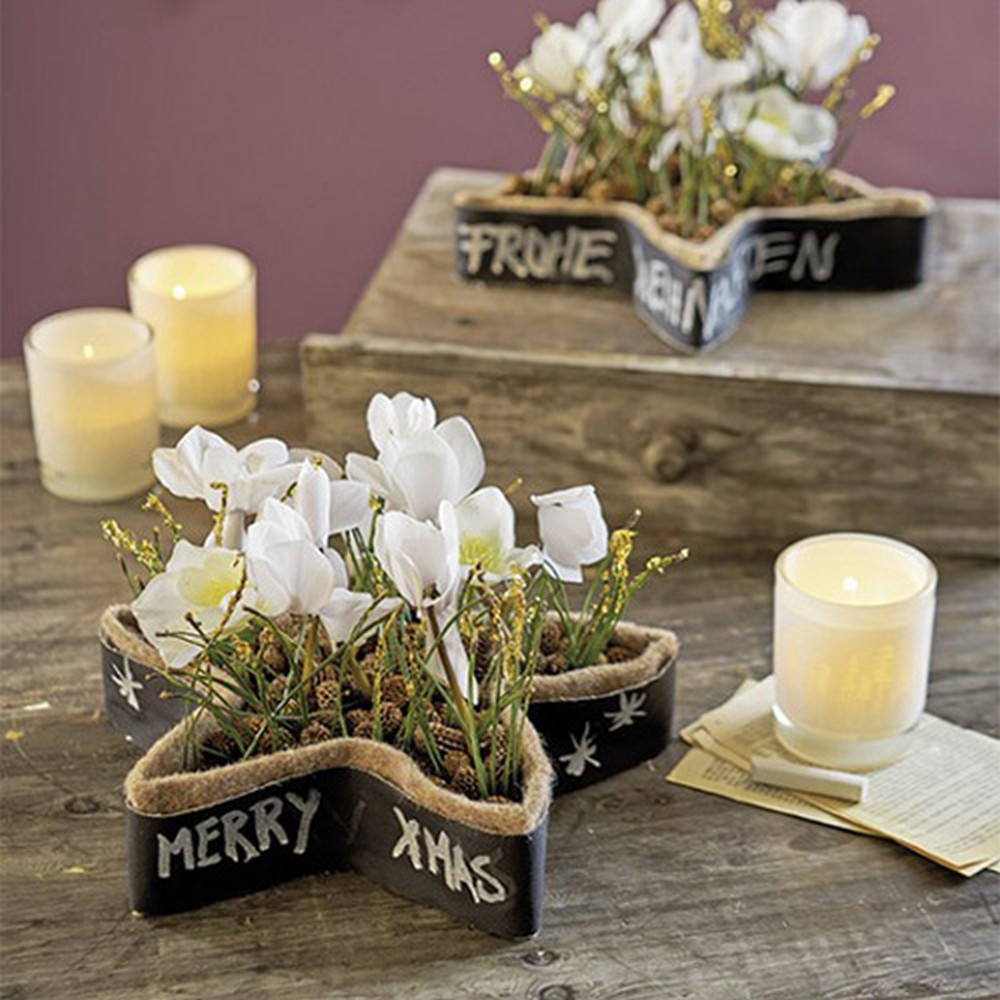 The star shape is of course particularly popular during the Christmas season. It is also gaining more and more importance in funeral floristry. So you can equip the stars with cones, berries and a candle depending on the occasion. White flowers, cut greens and mourning ribbons with comforting sayings are also conceivable. The edges can be covered with pine green and other decorative materials such as ribbons. With double-sided adhesive tape, the flower arrangement can be attached to smooth surfaces, for example on a coffin or on a gift.