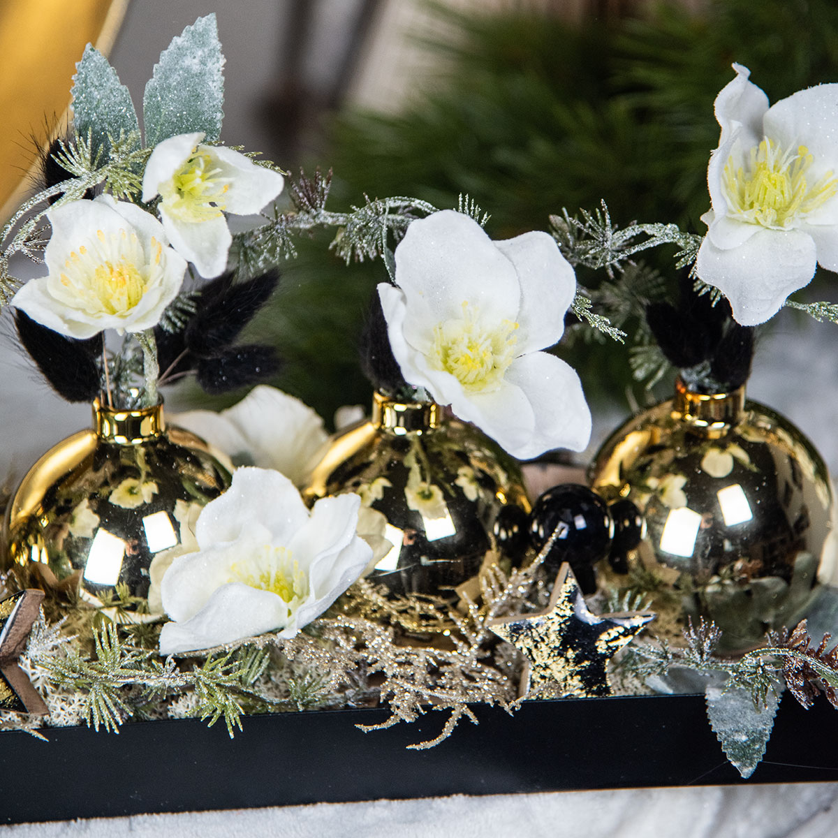 White Christmas roses are considered Christmas flowers in many places. However, these artificial flowers are not great table decorations for Christmas, but also as winter decorations. Because the extremely fine glitter gives the snow rose a frosted effect.So you get beautiful artificial flowers for Christmas and as a winter decoration! Blossoms and leaves of the white Christmas roses are covered with glitter. There also seems to be a hint of ice on the white Christmas rose. Even the stem and the leaves have a slight white shimmer in addition to the glitter look.
