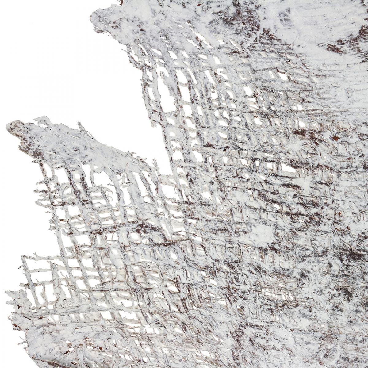 Elongated palm fibers were laid one on top of the other, coated with white paint and then dried. This process resulted in leaf-like forms with an aesthetic fringed look.