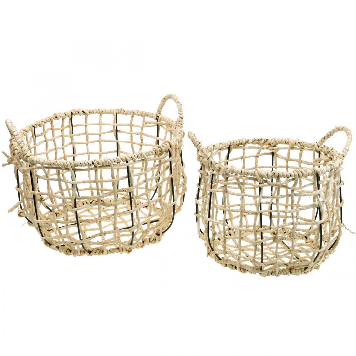 The basket is made on a basic frame made of sturdy metal in black. Rush grass is intertwined between the metal struts. The upper and lower edge of the wicker basket and its handles are completely wrapped with the string of seaweed.