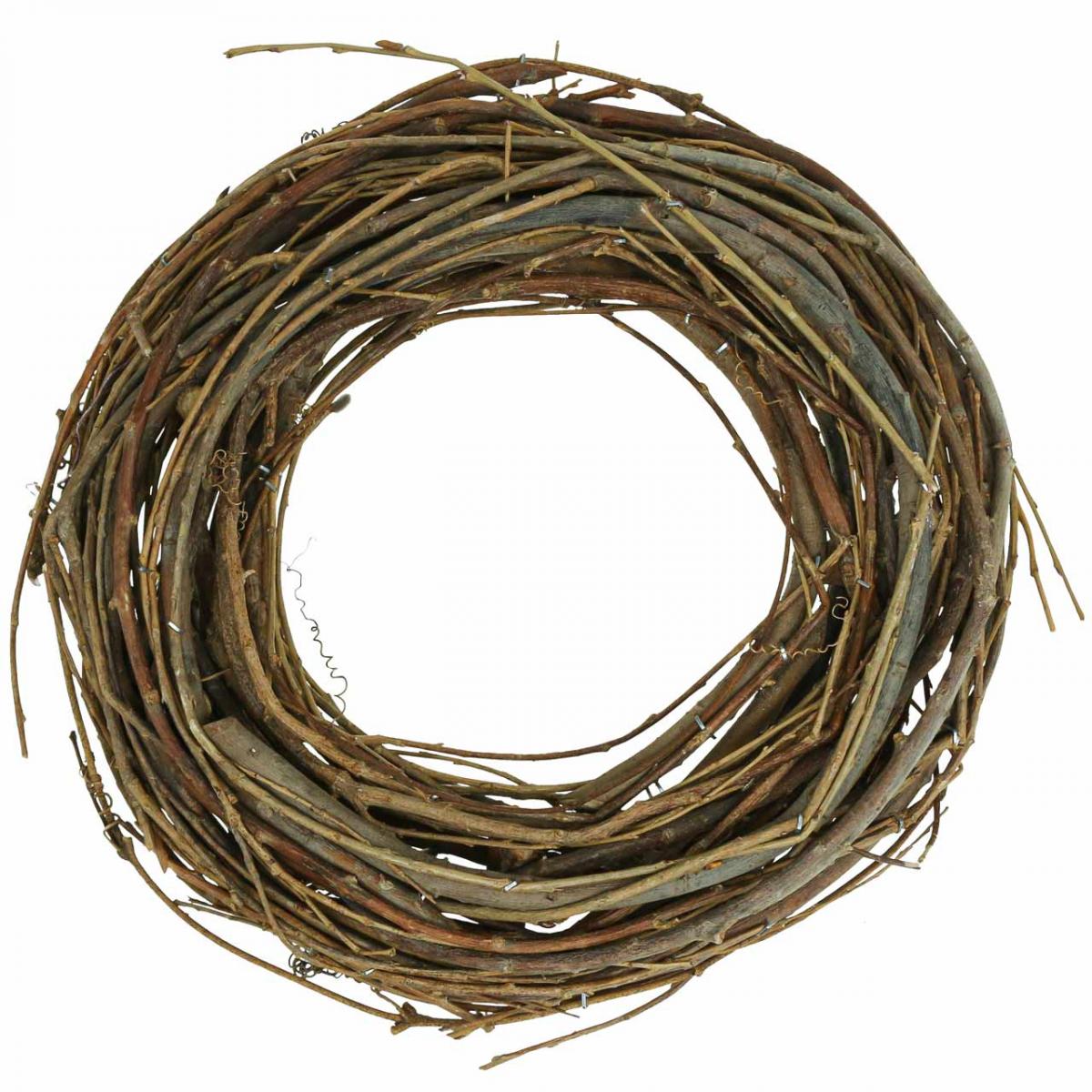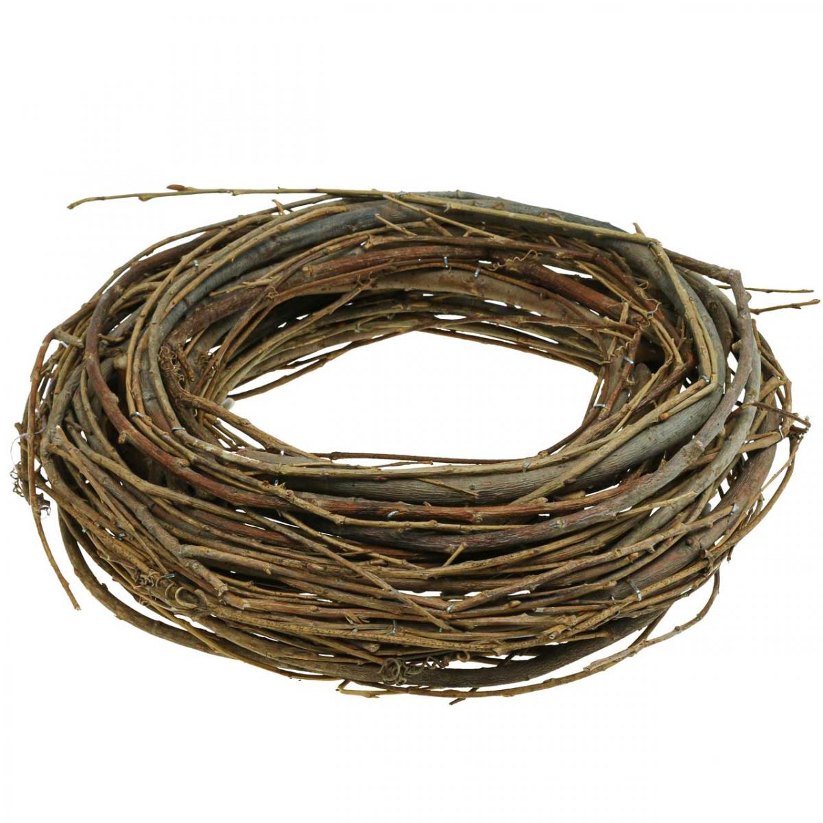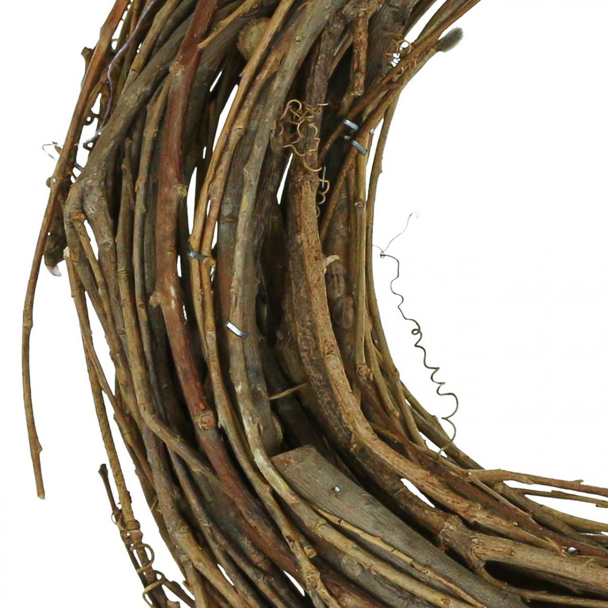 The decorative wreath is woven from branches of the willow tree and is held together with metal clips. The branches are of different thicknesses and natural.