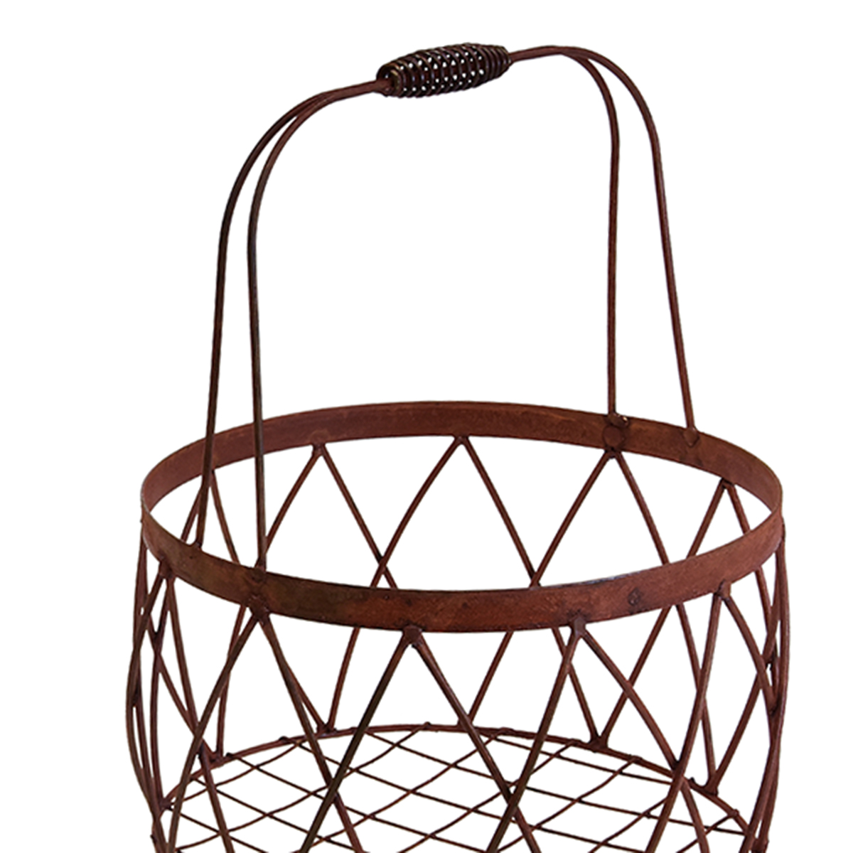 Patina gives the metal basket a warm color, which, as is characteristic of rust, appears bright orange in some places and darker brown in others.