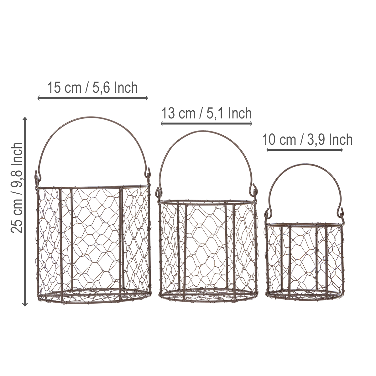 This set of three wire baskets is a winner all around. Made of sturdy metal and exceptionally durable thanks to their fine mesh, they are the perfect addition to any modern home. With a diameter of 15 cm (large basket) and a height of 25 cm, they can hold practically anything you want to keep organized. Fruits and vegetables? No problem. Kitchen utensils or cloth napkins? Perfect. Or perhaps you prefer a decorative touch? Plant arrangements and flowers unfold their special charm in these baskets. Thanks to their round shape and sturdy carrying handle, the baskets can be easily moved from room to room or into the garden. Anyone who loves the vintage style will be instantly captivated. The brown color ensures that the set blends harmoniously into any décor – from Scandinavian minimalism to rustic country style. The baskets look particularly good when combined with other decorative elements made of natural materials. Why not give them a try?