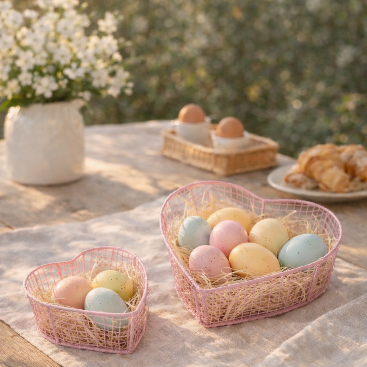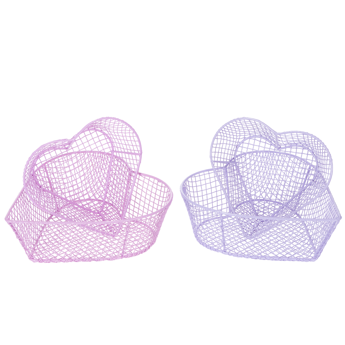 Create a romantic yet organized atmosphere with these beautiful heart-shaped wire baskets. Whether used as a decorative accent on the table, for storing small items, or as a stylish gift set, these heart-shaped metal baskets bring love and order to your home. Made of sturdy metal, the baskets come in soft pink and purple tones. They are perfect for use in living areas or sheltered outdoor spaces and are the ideal choice for romantic table decorations at special occasions such as weddings, Valentine's Day, or birthdays.