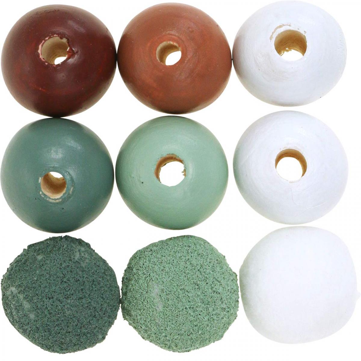 The wooden balls with a hole come in the colors dark green, light green, dark brown, light brown and white. There are also eight greenish decorative balls without a hole made of solid plastic, which look like moss balls from the surface structure. The last four decorative balls without a hole are white and soft, like small snowballs. The colors and texture of the wooden beads and decorative balls are ideal for creating autumn and Christmas decorations.