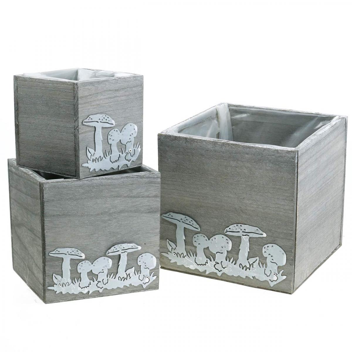 Wooden cubes with mushrooms, autumn decoration, plant box 20/16/12 cm, set of 3