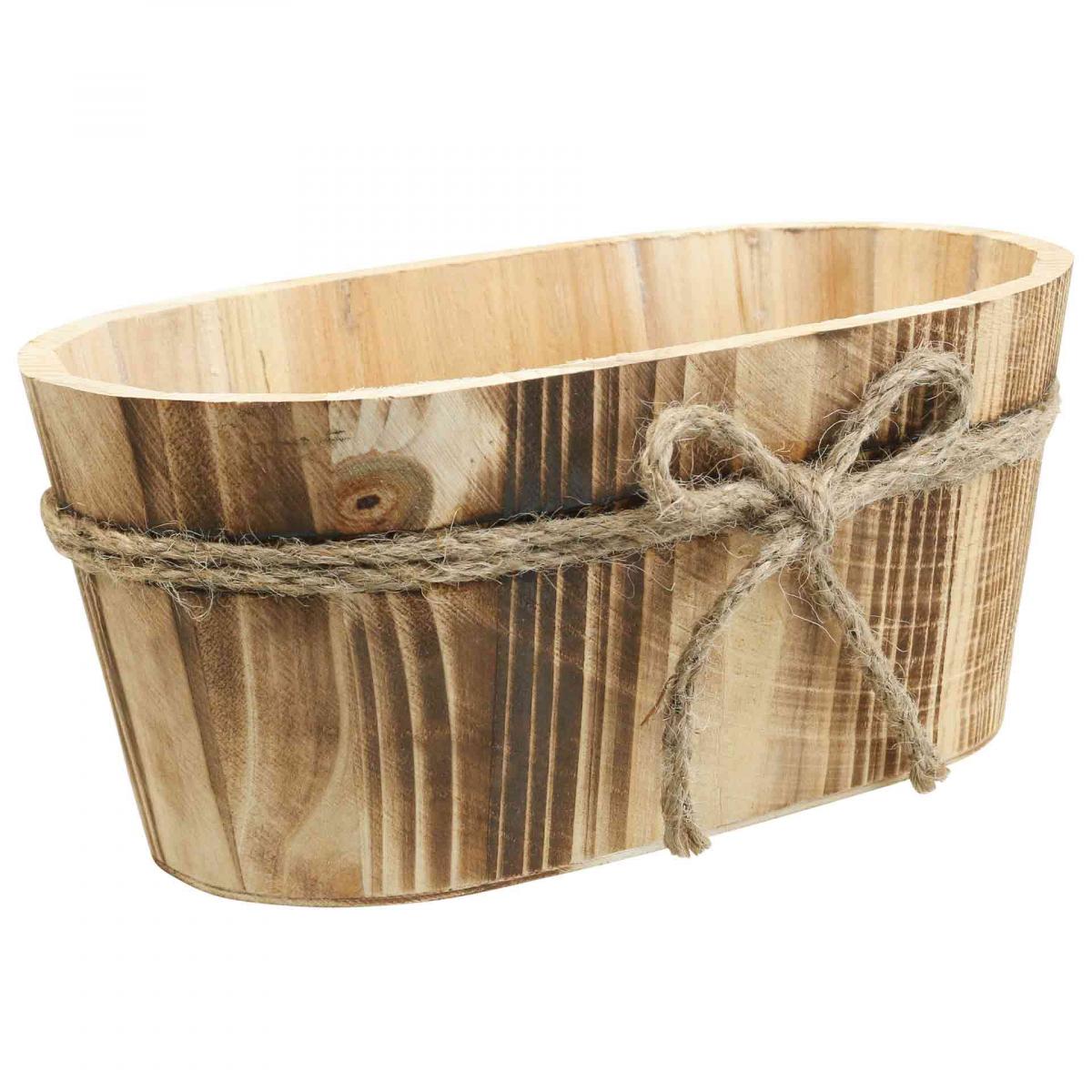 The country house style and the naturalness of the wooden shell are also underlined by the double jute cord with the beautiful bow embedded in the wood. Inside the wooden vessel is completely untreated. If you line the bowl with foil, it can still serve as a plant pot or oval planter for live flowers.
