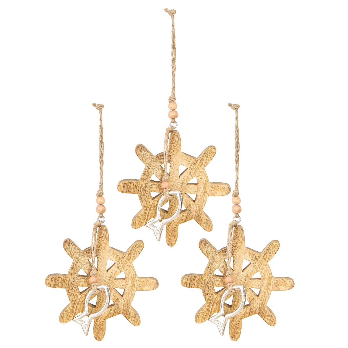 Wooden steering wheel with small metal fish – maritime decorative pendant in natural and silver