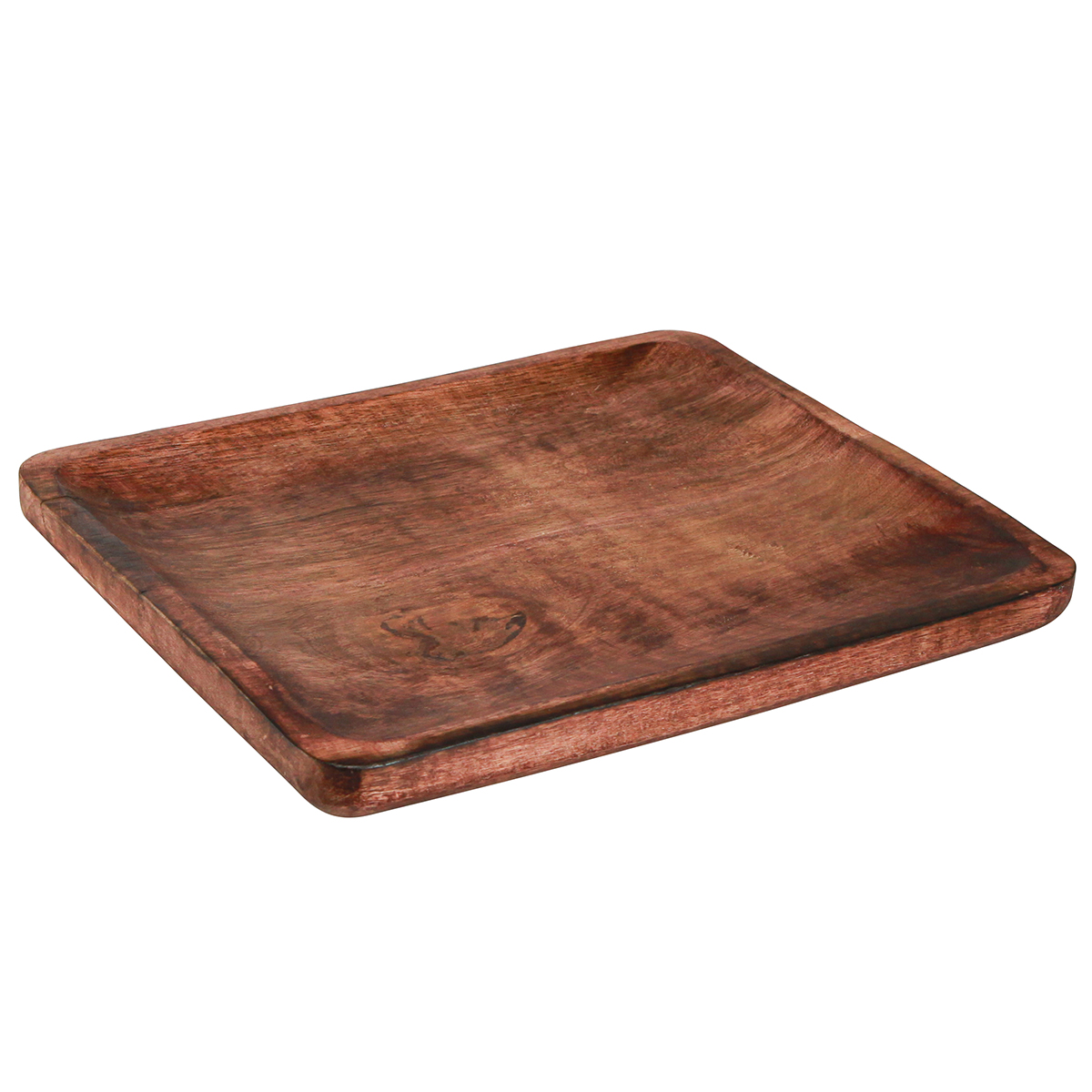 - Dark brown wooden tray in rectangular shape with rounded corners.