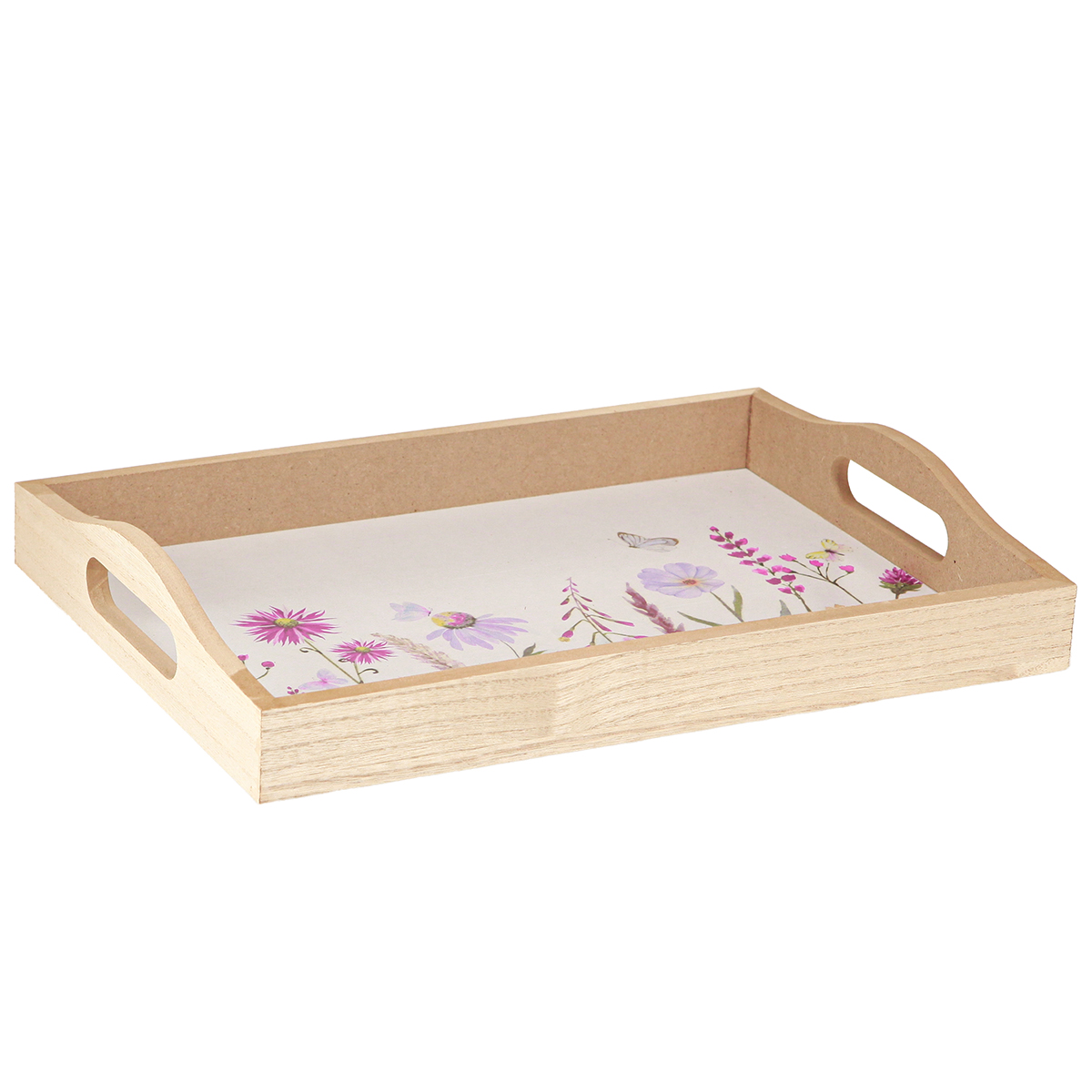 Rectangular wooden tray in natural with flowers and butterfly – a versatile decorative element in country house style