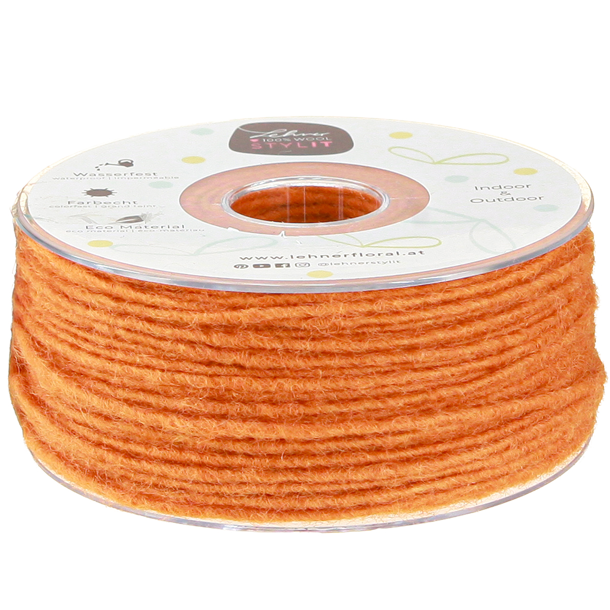 The orange woolen cord is around 100 meters long and around 3 millimeters thick, although this thickness can vary slightly due to the flexibility of the material. You receive the decorative cord, made of 75% wool and 25% jute, rolled up on a plastic spool.