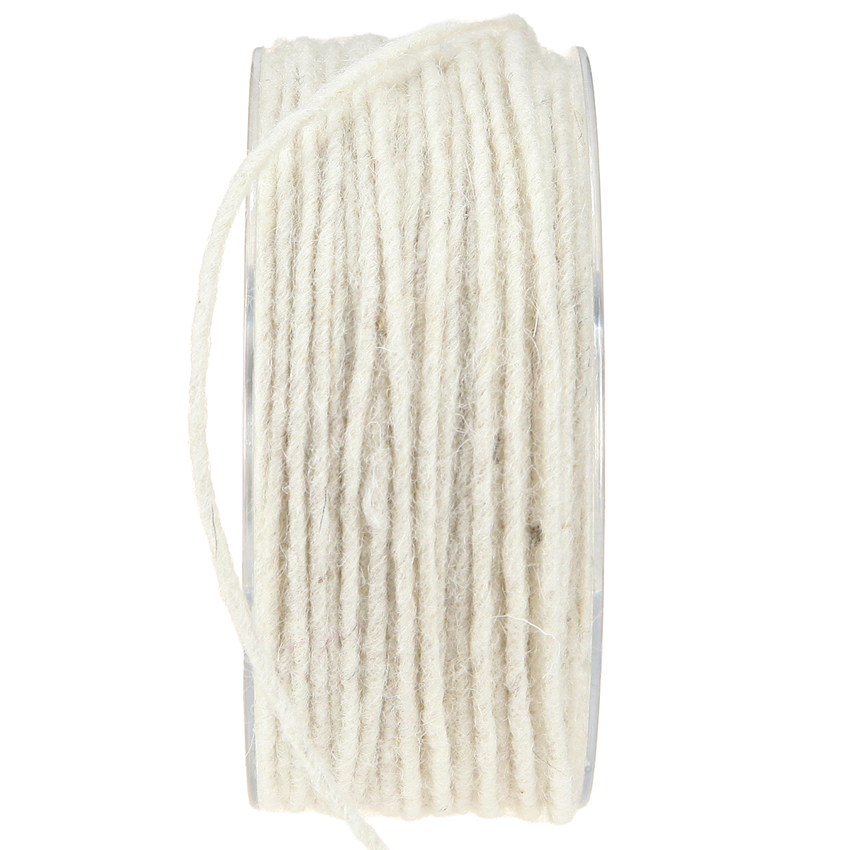 The white wool cord, made of 75% wool and 25% jute, is around 3 millimeters thick and around 100 meters long. You receive the decorative cord rolled up on a plastic spool.