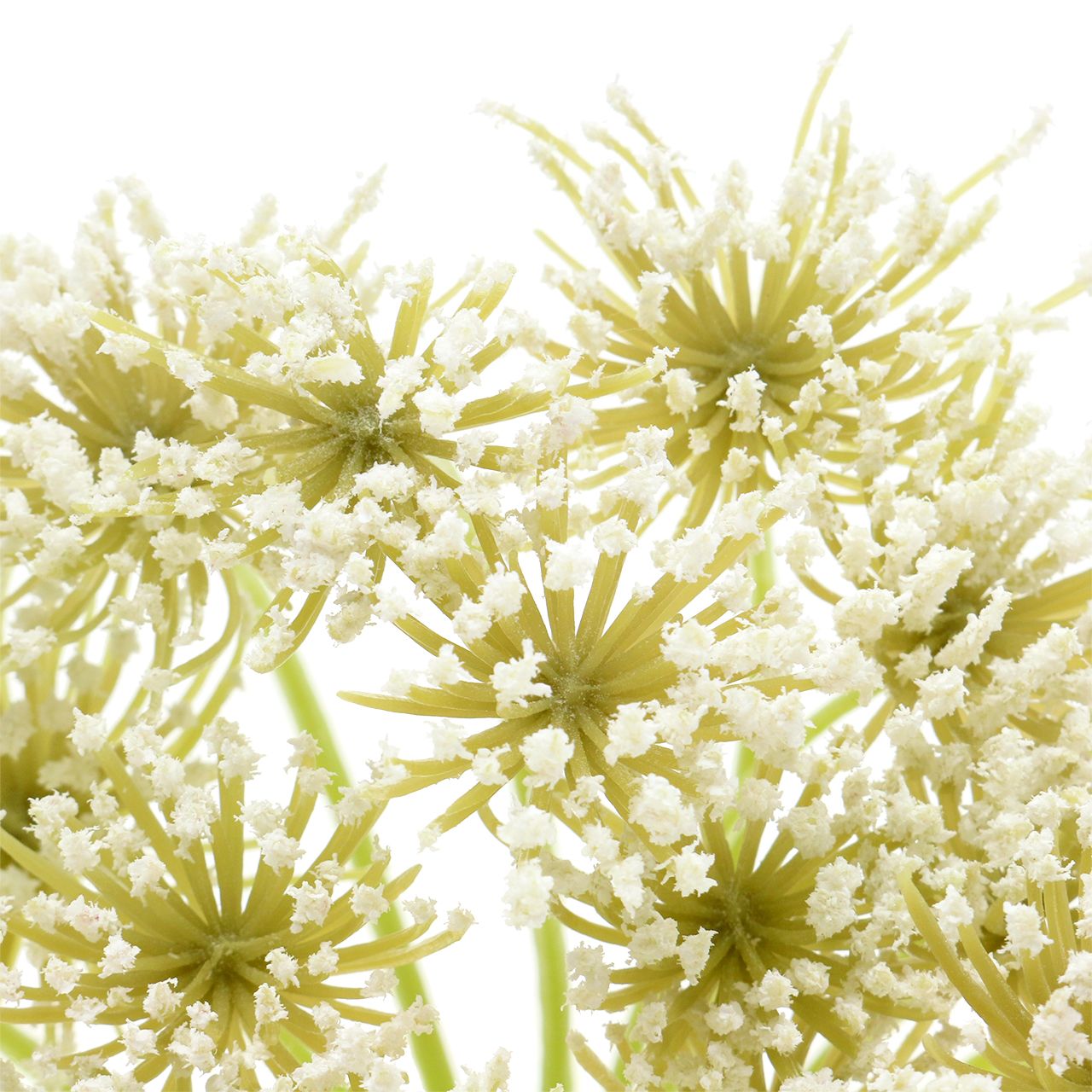 The artificial yarrow in white has a length of around 84 centimeters, with the diameter of the flower head being around 25 centimeters. It consists entirely of plastic or silk fabric.