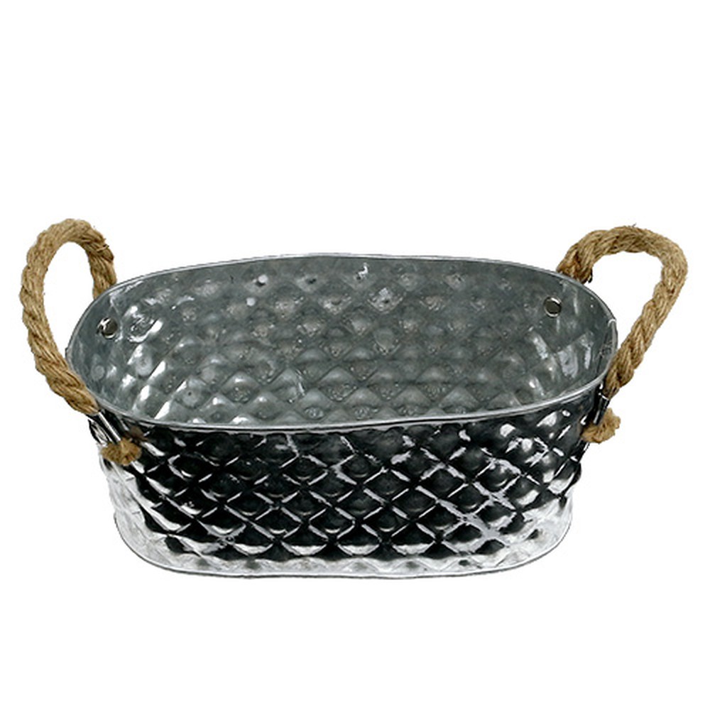 The classically designed, oval zinc bowl is ideal for planting and decorating. The planter bowl also has two handles made of natural-colored flax on the elongated sides, which harmonize wonderfully with the shiny silver of the metal. In addition, the surface of the bowl is decorated with a diamond shape that has been skillfully punched into the metal. For this purpose, the intermediate points were very lightly painted with white paint, so that the diamond shapes stand out better and become more visible.