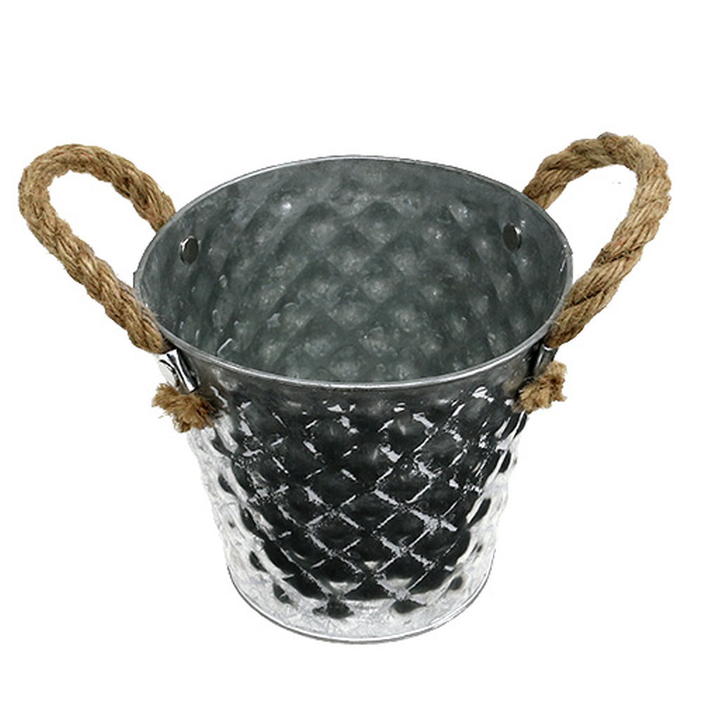 The zinc pot with a white diamond pattern and rope handles has an opening diameter of around 14.5 centimeters and a height of around 13 centimeters. The bottom of the bucket is approximately 10 centimeters in diameter.